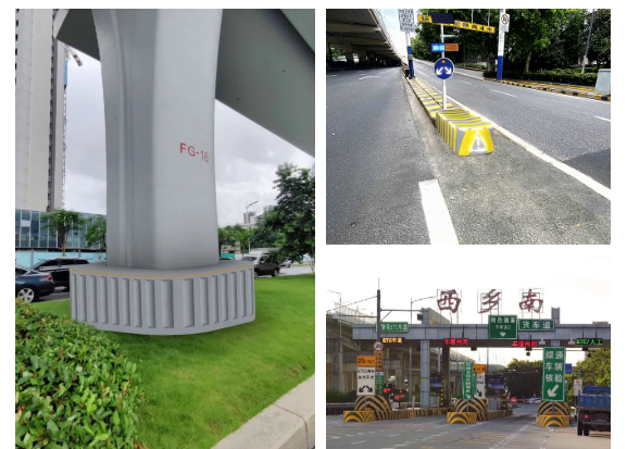 緩沖吸能型安全島島頭吸能等級可根據(jù)不同場景進行設計,應用于快速路匝道鼻端島頭、高速收費站島頭和橋墩防護等更多場景。